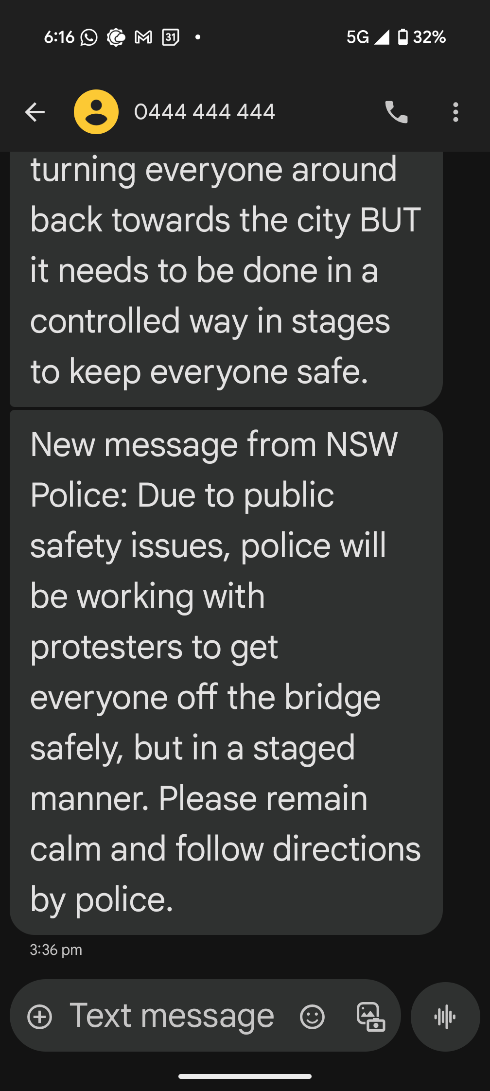A third text message at 3.35PM told protestors that police would be working with organisers to get everyone off the bridge in a staged manner.