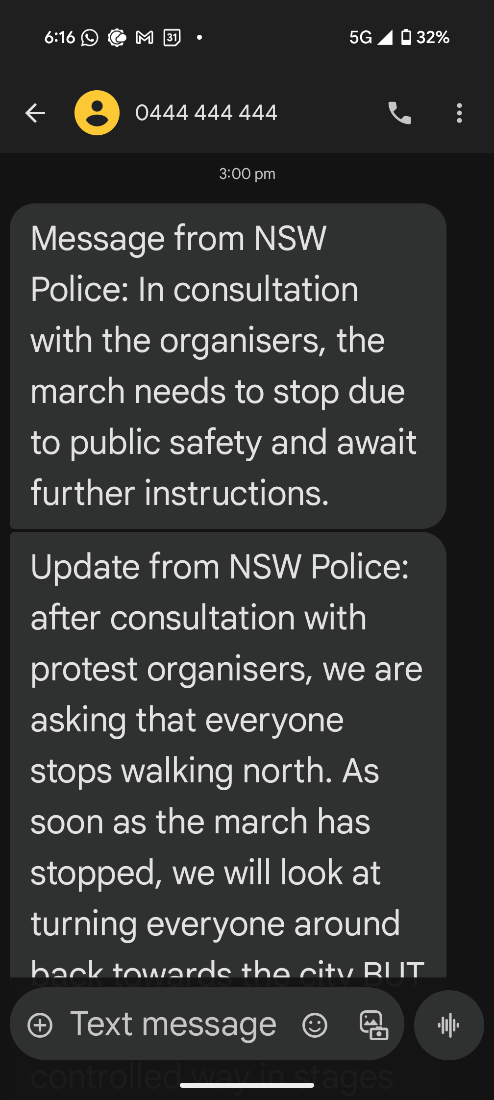 Texts received by protestors from NSW Police